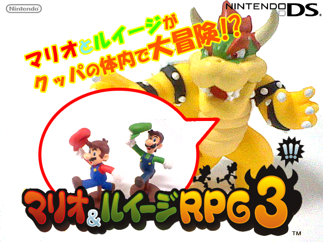 家にあったマリオのフィギュアたちでマリオ&ルイージRPG3!!!のポスターぽいものを作ってみました。